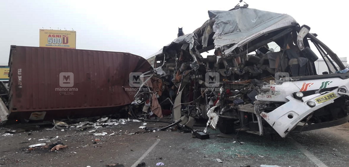 പുലര്ച്ചെ മൂന്നേകാലിനാണ് ബെംഗളൂരുവില് നിന്ന് കൊച്ചിയിലേക്കുവന്ന ബസില് കൊച്ചിയില് നിന്ന് സേലത്തേക്ക് ടൈലുമായി പോയ ലോറി ഇടിച്ചുകയറിയത്. നിയന്ത്രണം വിട്ട് ഡിവൈഡര് തകര്ത്ത ലോറി മറുഭാഗത്തുകൂടി പോയ ബസിന്റെ വലതുവശം തകര്ത്തു. ഡ്രൈവറും കണ്ടക്ടറും ഉള്പ്പെടെ 19 പേര്ക്ക് ദാരുണമരണം. ബസ് നാമാവശേഷമായി.